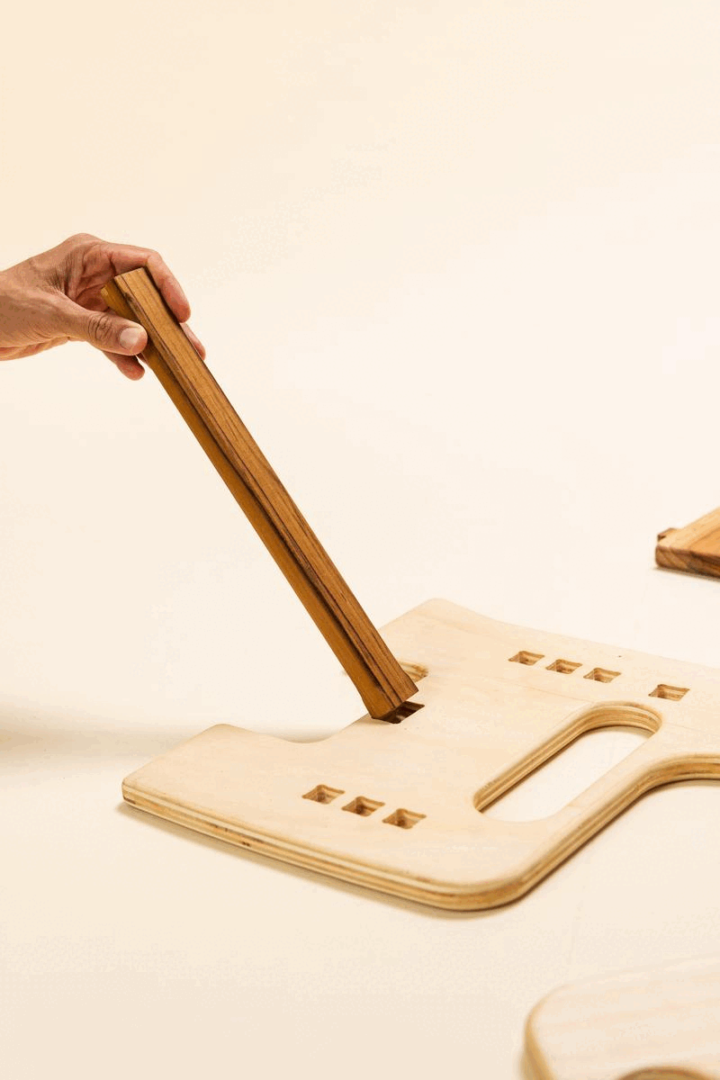3. Inserta el palo horizontal de teca en el agujero inferior de la pata.